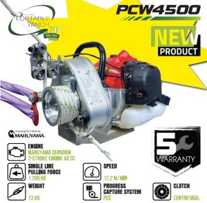Vi presenterer PCW4500, den nyeste og kraftigste modellen fra Portable Winch Co. Dette er den første vinsjen i produktserien med 2-taktsmotor, og den er spesielt utviklet for krevende, profesjonell bruk. Motoren fra Maruyama Japan er kjent for sin driftssikkerhet og kommer med hele 5 års garanti.