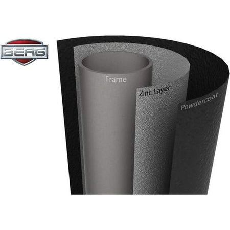 Rammen til Elite-trampolines har veldig lang levetid. Dette skyldes den store diameteren på 42 mm og veggtykkelsen på 2 mm. I tillegg har rammen et solid lag av sink, og rammen på Regular-trampolinene har beskyttende svart pulverlakkering. Rammen motstår derfor rust ekstra godt.