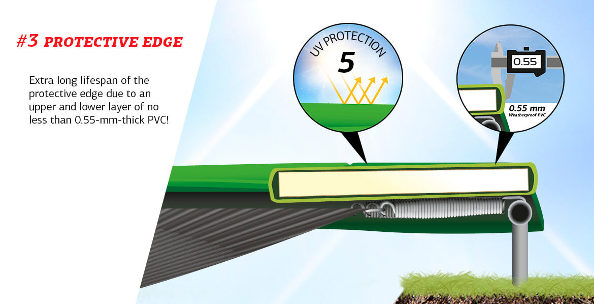- Den beskyttende kanten har ekstra lang levetid på grunn av et øvre og nedre lag på hele 0,55 mm tykk PVC!