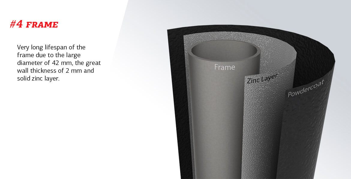 - Diameter bein/veggtykkelse på toppramme: Ø50.8×2.0 mm