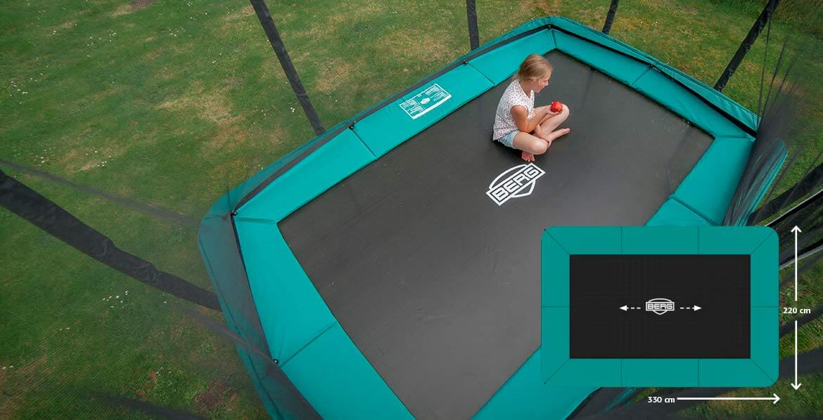 Utformingen av Berg Ultim Champion trampolinen sikrer at du kan hoppe trygt og over et lengre tidsrom på en utmerket trampoline. Fordelen med en rektangulær trampoline sammenlignet med en rund trampoline er at du kan hoppe over hele lengden. På grunn av formen passer trampolinen til nesten enhver hage.