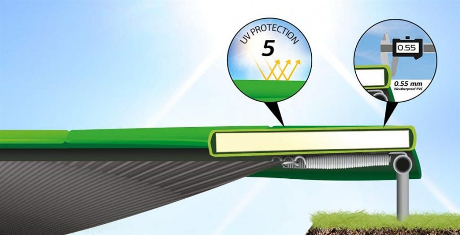 Ultim Champion er naturligvis utstyrt med Airflow hoppematte og TwinSpring-fjærer. Hoppematten AirFlow slipper gjennom 50 % mer luft. Dette gjør at du kan hoppe høyere og blir mindre sliten. TwinSpring-fjærene er plassert diagonalt. Trampolinen har som følge av det flere fjærer, og de er også lengre. Dette sikrer deg mer glede ved å hoppe og gir deg den perfekte hoppeflaten.