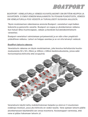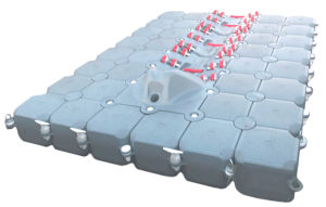 Den er bygget ut av modulære flytende kuber 50 x 50 x 40 cm og kroppsdeler 100 x 100 cm utstyrt med horisontale og laterale ruller. Inngangspartiet er V-formet med 1. rulle ved vannstand. På enden av båtløftet har hodedelen en hevet baug for å unngå overskyting.