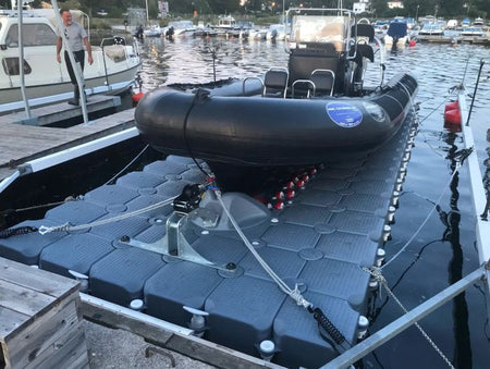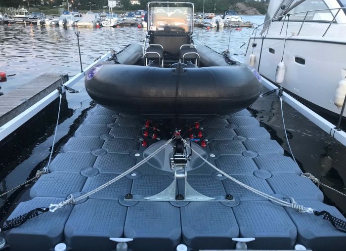Båten din eller RIB kan lett kjøre på plattformen gjennom motorkraften. På enden av båtbryggen er det en forhøyet stoppblokk som hindrer deg i å kjøre i kanten av brygga, det er også mulig å feste til stoppblokken om ønskelig.
