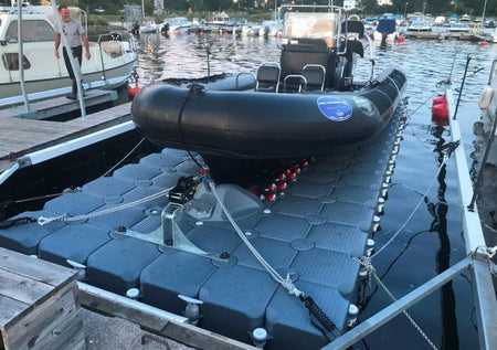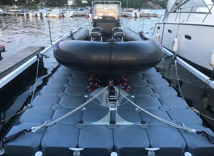Båten din eller RIB kan lett kjøre på plattformen gjennom motorkraften. På enden av båtbryggen er det en forhøyet stoppblokk som hindrer deg i å kjøre i kanten av brygga, det er også mulig å feste til stoppblokken om ønskelig.