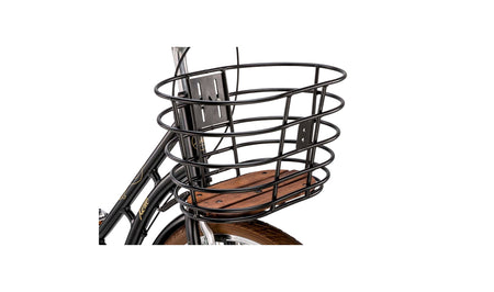 Den leveres komplett med skjermer, bagasjebærer, støtte, kjedeskjerm, ringeklokke og en fastmontert aluminiumskurv med trebunn – perfekt for handleturen.