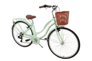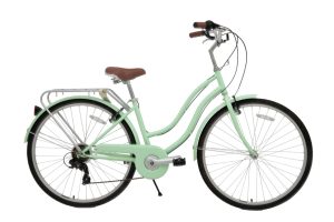 mintgrønn damesykkel med et elegant, buet design – perfekt for turer i byen, til butikken eller til jobb!