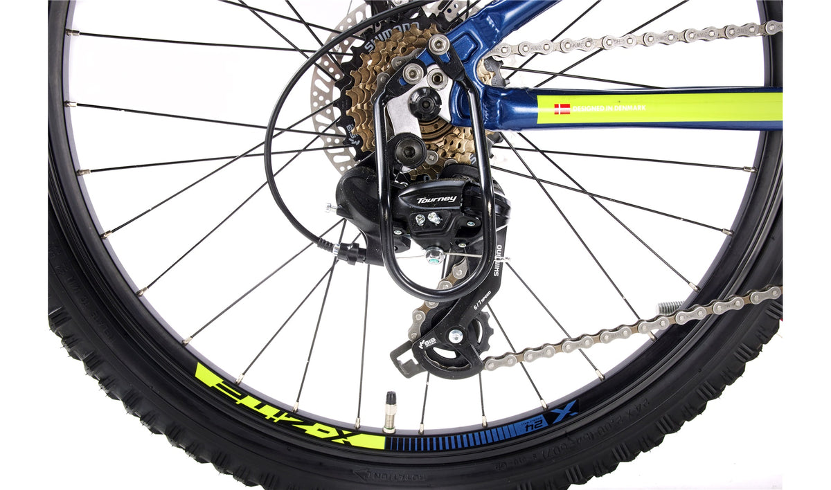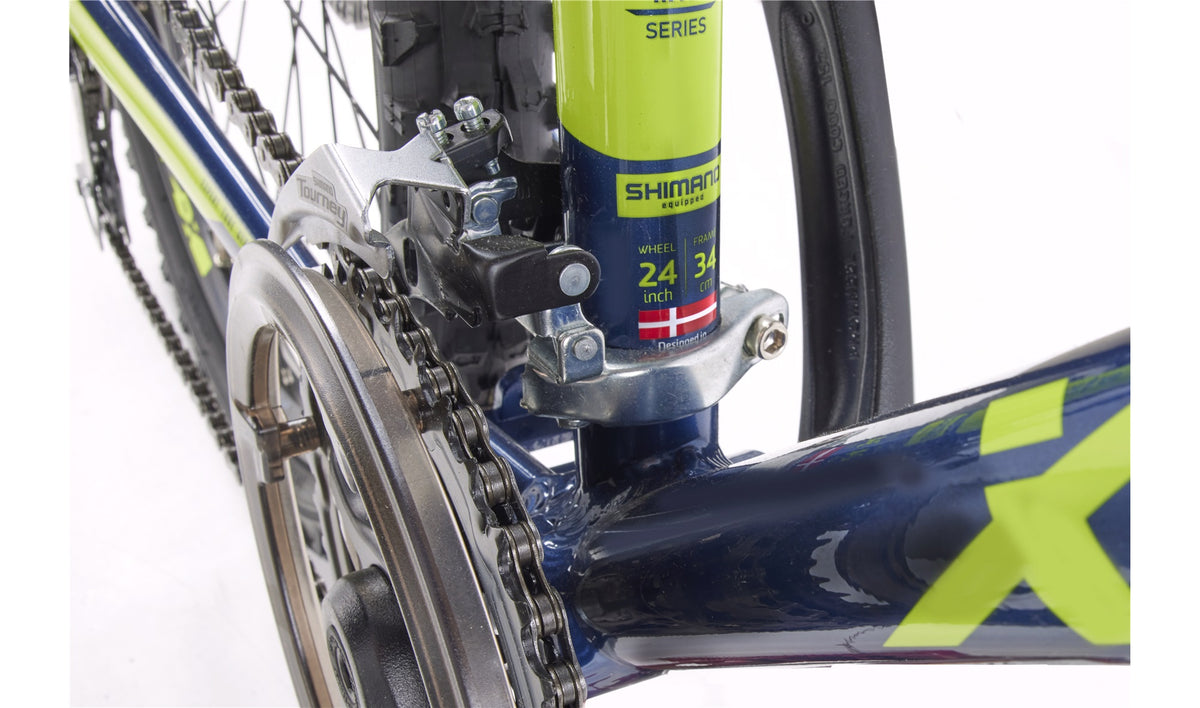 Med 24-tommers hjul, støtdempet forgaffel og grovmønstrede dekk takler sykkelen både grus, asfalt og skogsstier med letthet. Det presise Shimano Tourney-girsystemet med 21 gir (3x7) gjør det enkelt å finne riktig gir i alle situasjoner.