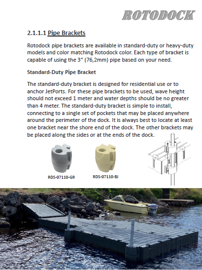 Standard fester for 3" vinkelrør er designet for badebrygger, marinabrygger eller for feste av JetPorts. For at rørfestene skal brukes, bør bølgehøyden ikke overstige 1 meter og vanndybden bør ikke overstige 4 meter.