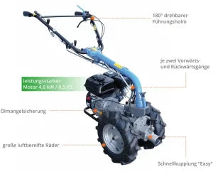 Maskinen har vært i salg i en årrekke og er en favoritt blant de som ønsker en kvalitetssterk multimaskin. Solid, lettstartet og driftssikker 4-takts Güde Power Engine motor sikrer et problemfritt arbeide. Dekkene har godt med traktormønster, styret er vibrasjonsdempet og maskinen har automatisk bremsefunksjon under drift.