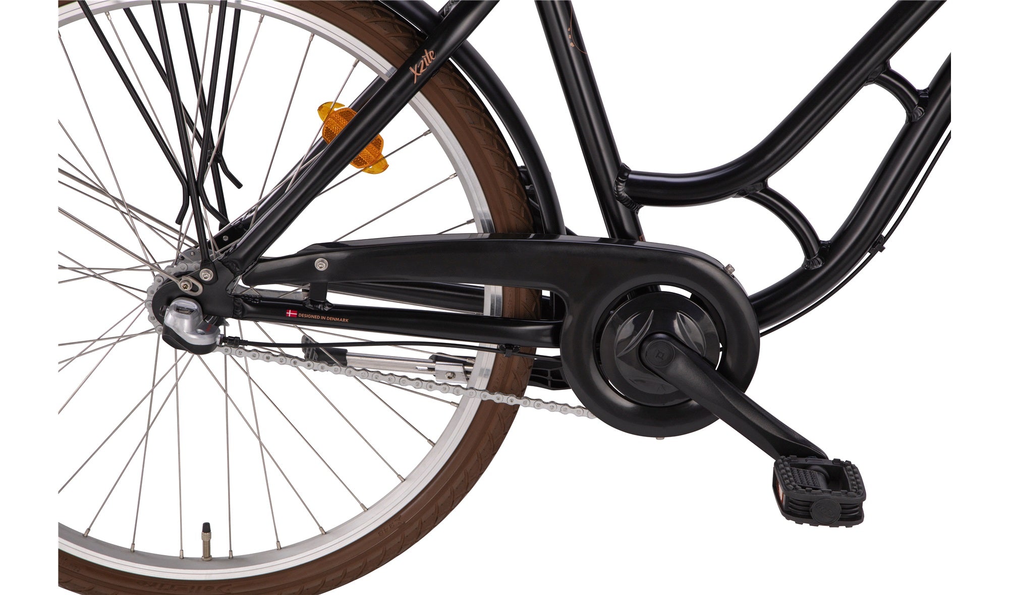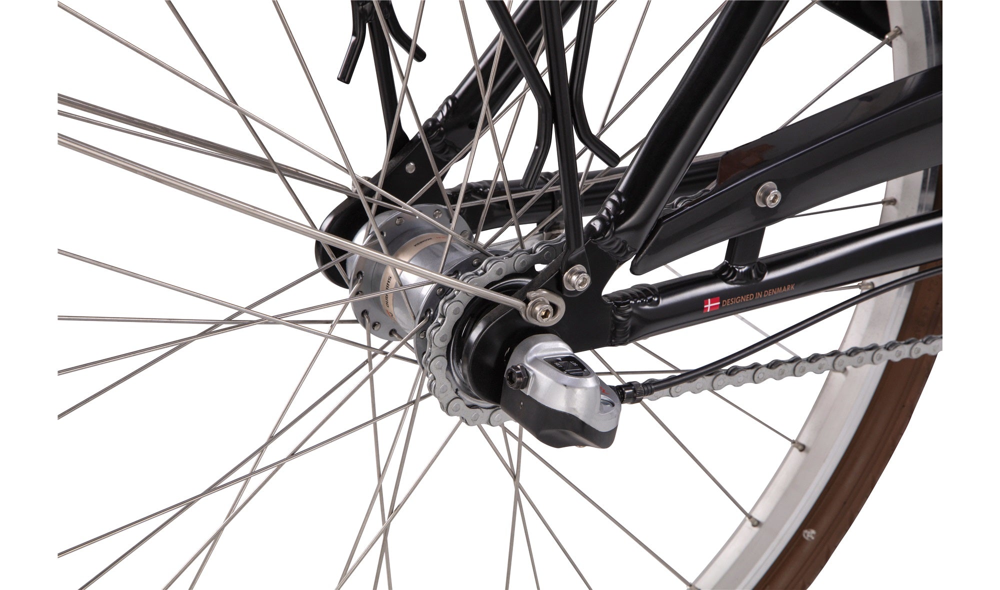 Sykkelen har 3 innvendige Shimano Nexus-gir, dobbelbunnede aluminiumsfelger med rustfrie eiker, og en praktisk bagasjebærer. Med V-brems foran og fotbremse bak får du trygg og enkel kontroll i alle situasjoner.