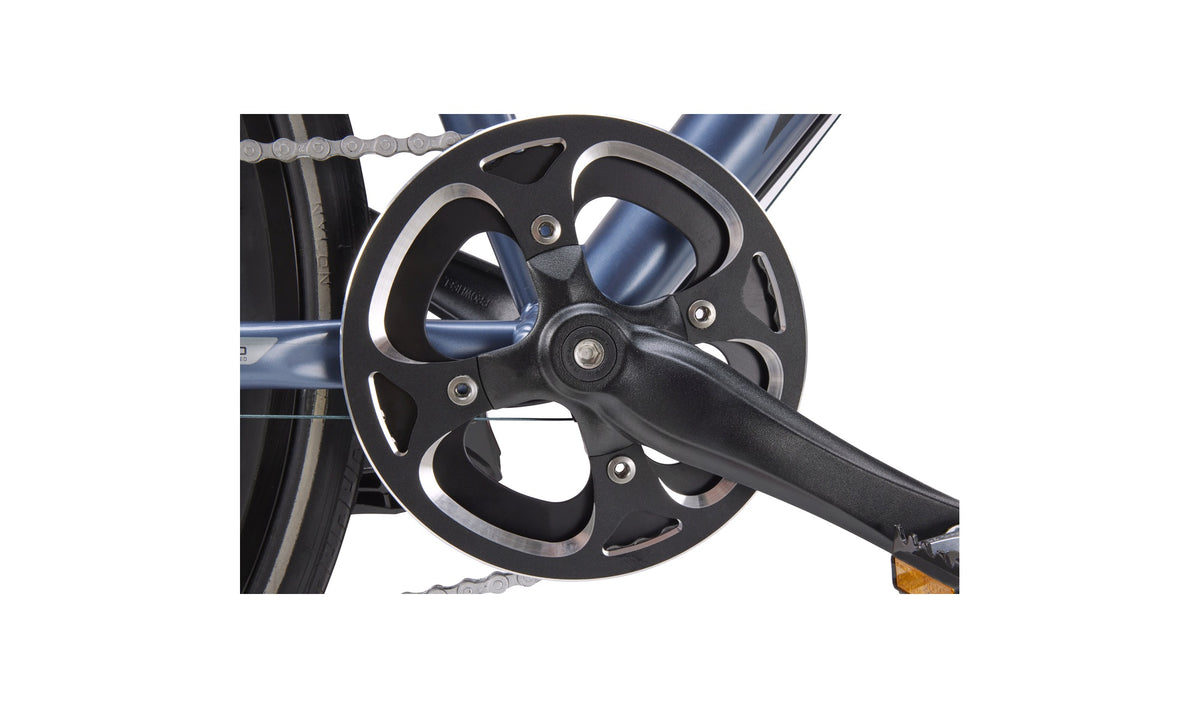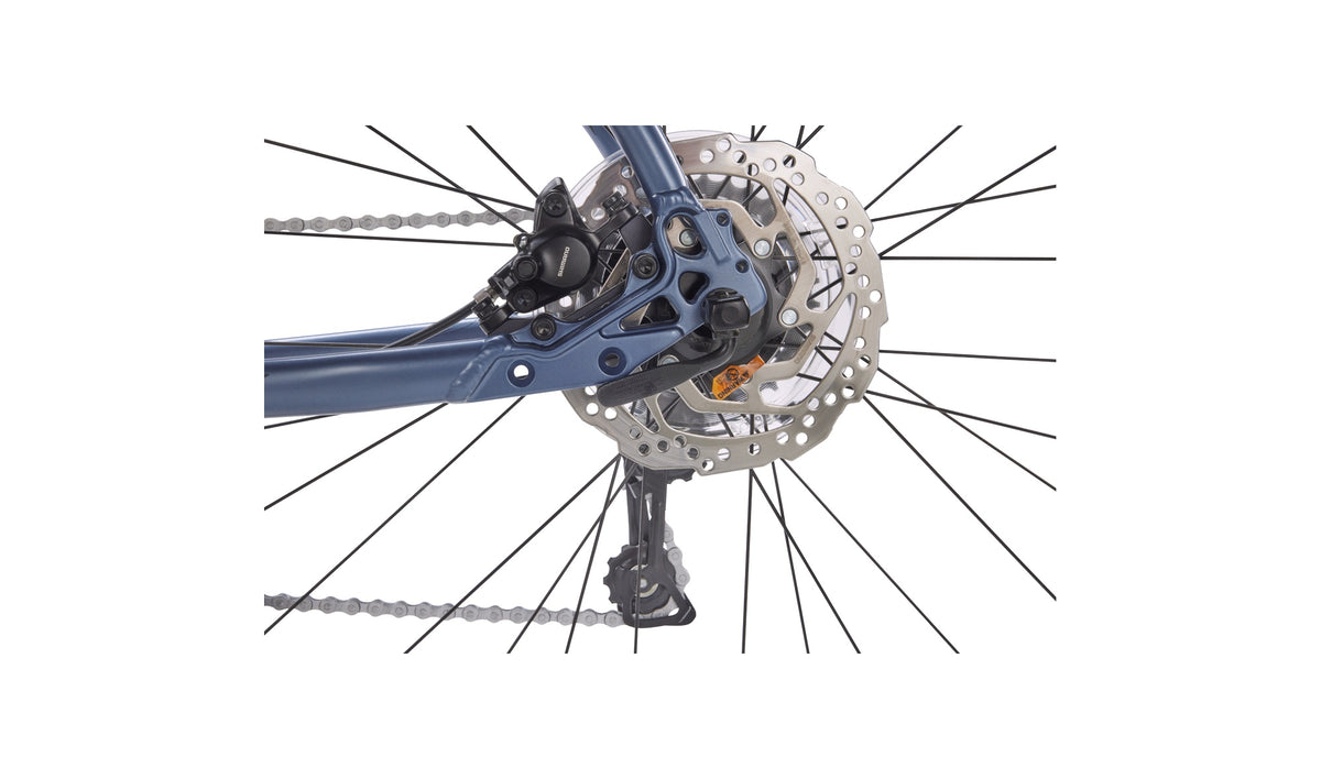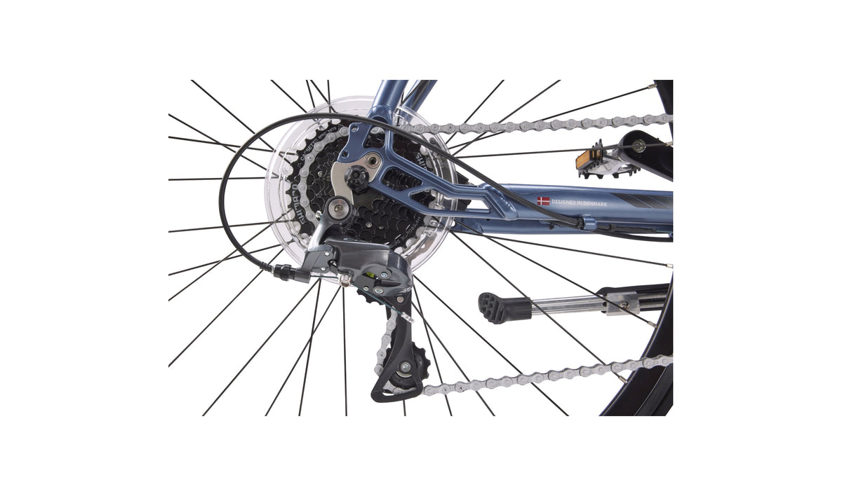 Sykkelen er utstyrt med 8 utvendige Shimano Claris-gir og lukkede kranklagre for driftssikker ytelse. Høyprofils doble aluminiumsfelger med rustfrie eiker, samt dekk med refleksstripe, gir deg trygghet og synlighet i trafikken.