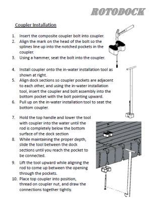 Installasjonsverktøy for Rotodock-kobling Installasjonsverktøy hjelper til med å montere koblingene mellom Rotodock-elementene. Også godt verktøy når du monterer flere JetPort Plus/Max/Flexi ved siden av hverandre. Juster dokkeseksjonene slik at koblingslommene er ved siden av hverandre. Bruk deretter installasjonsverktøyet i vann og sett inn koblingen og boltenheten i bunnlommen med bolten pekende oppover. Trekk opp i vanninstallasjonsverktøyet for å feste bunnkoblingen. Mens du holder trykket, sett inn toppkoblingen i den motsatte lommen ved å justere hullet i toppkoblingen over stangen og skyve koblingen inn i lommen. Installer koblingsmutteren på bolten og stram til toppen av mutteren er lik nivået på koblingen.