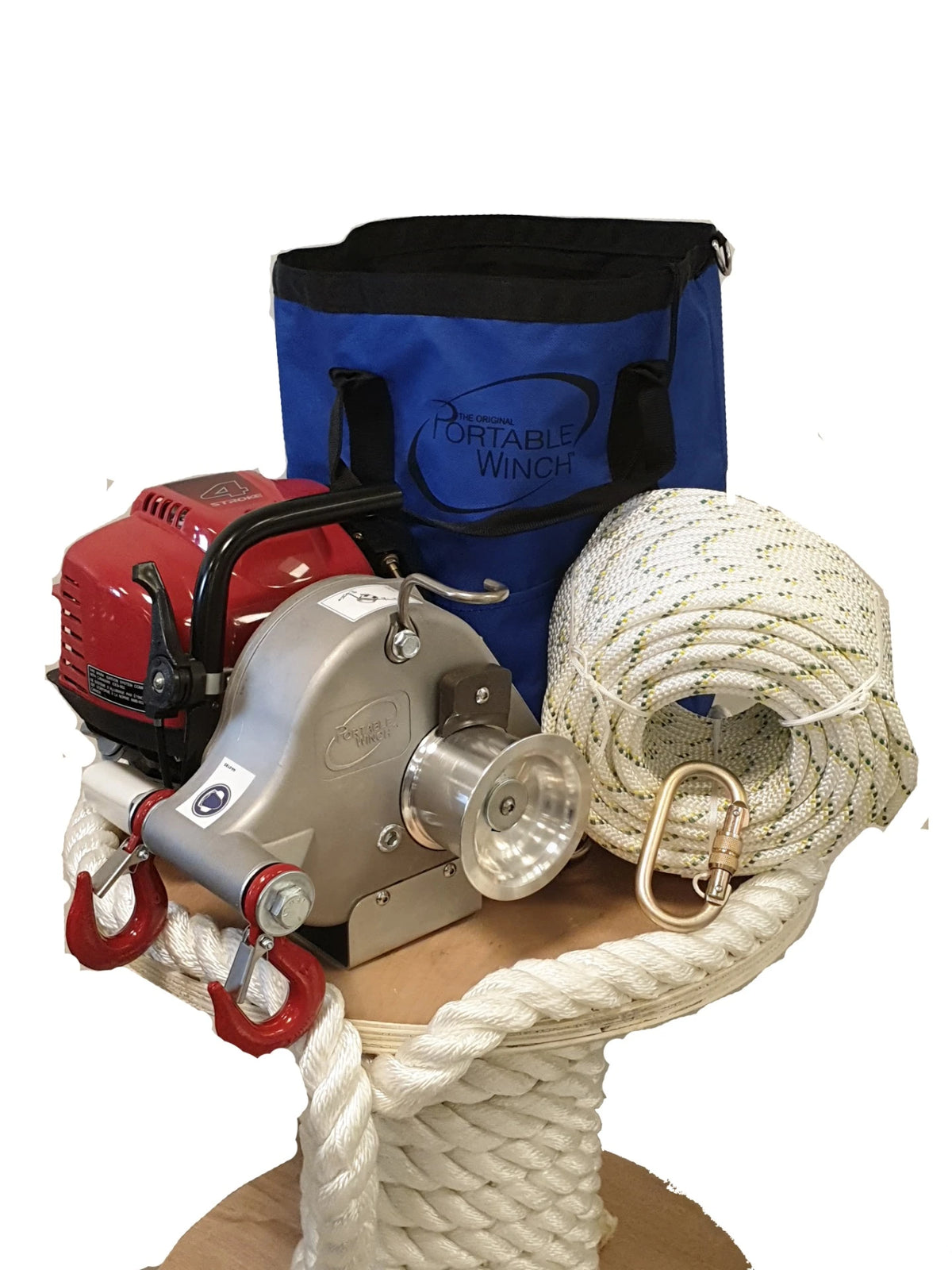 Tilbudet inneholder vinsj, tau 50 meter 10mm, taubag, 1 stk karabin og en festestropp til vinsj.