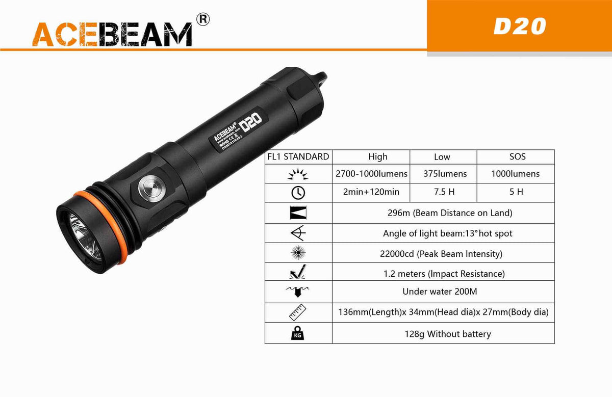 Acebeam D20 er bygget for dykkere som krever lommelykt som kan operere i dybder opptil 200 meter, men kan også brukes til utendørs aktiviteter/arbeid. D20 lommelykten kan konkurrere med det beste av det beste på land eller under vann, noe som gjør den til en virkelig allsidig lommelykt!