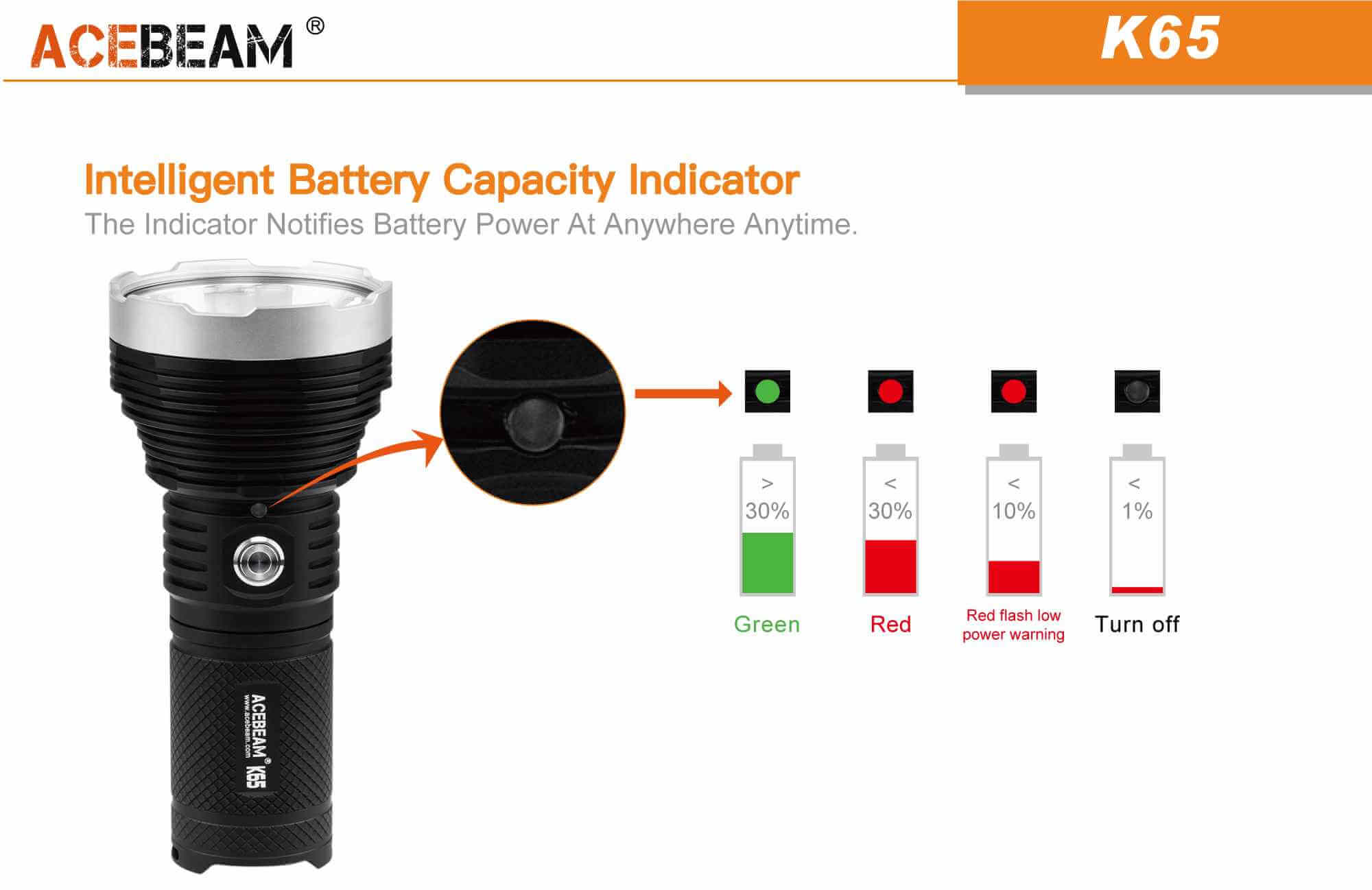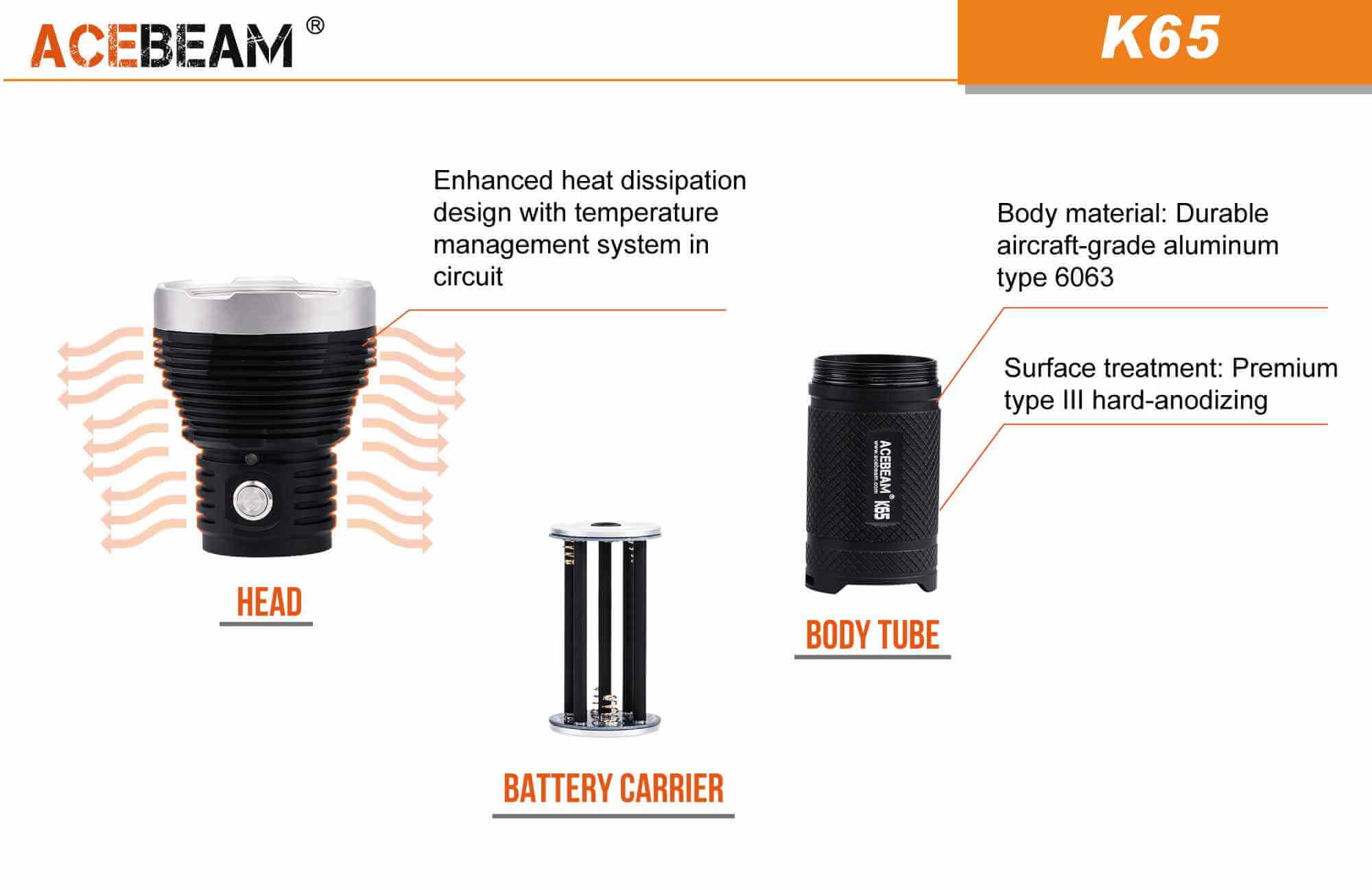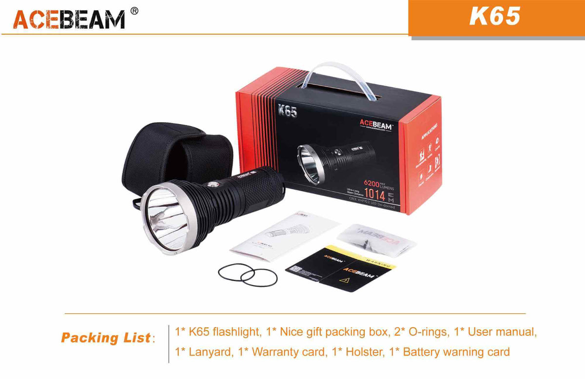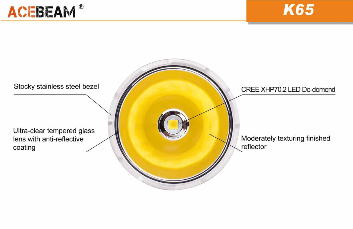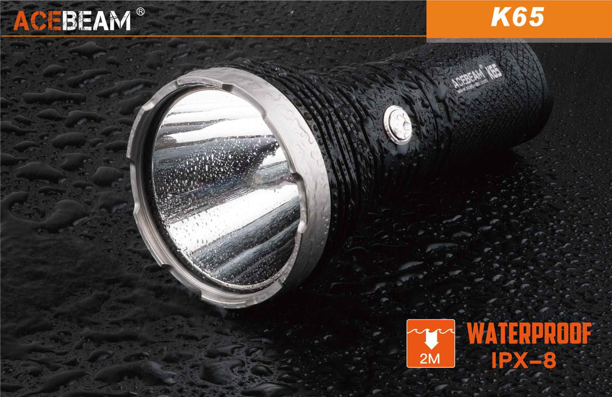 Acebeam K65 - en ny kraftig håndlommelykt, som er en forbedret versjon av den mest populære lommelykten K60. Det er økt lysstyrke på lommelykten K65 til 6200 lumen, det maksimerer også utgangspotensialet til Cree XHP70.2 pæren med en maks lysintensitet på 257000cd.
