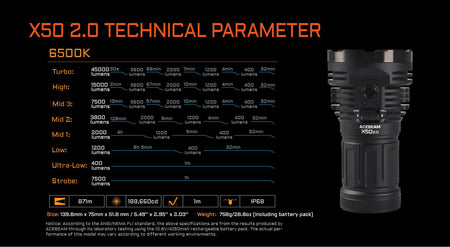 Opplev ekstrem lysstyrke og ytelse med Acebeam X50 2.0, en oppgradert kraftpakke som setter standarden for profesjonelle lyskastere. Med hele 45 000 lumen og en rekkevidde på opptil 800 meter, lyser X50 2.0 opp alt foran deg – enten du er på redningsoppdrag, tur i villmarken eller jobber i krevende forhold.