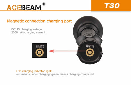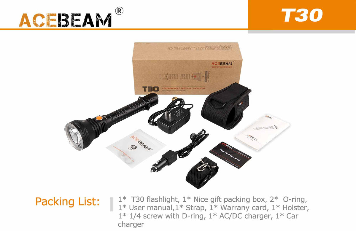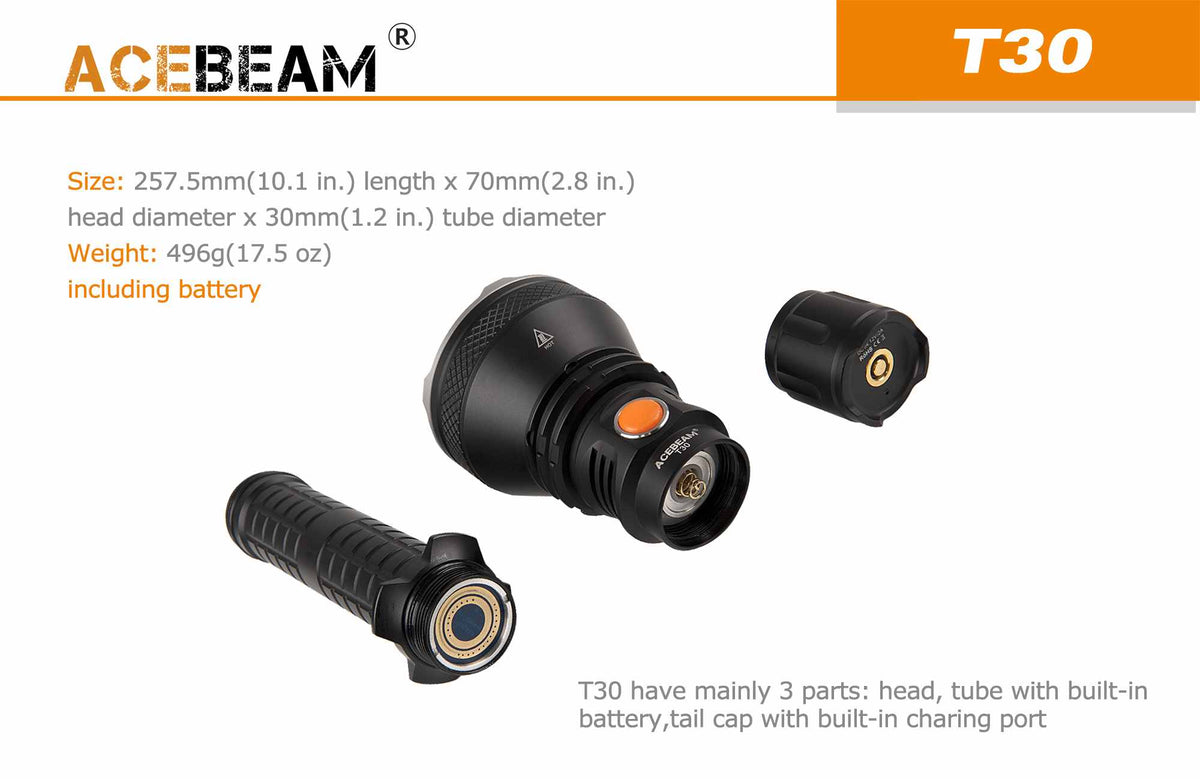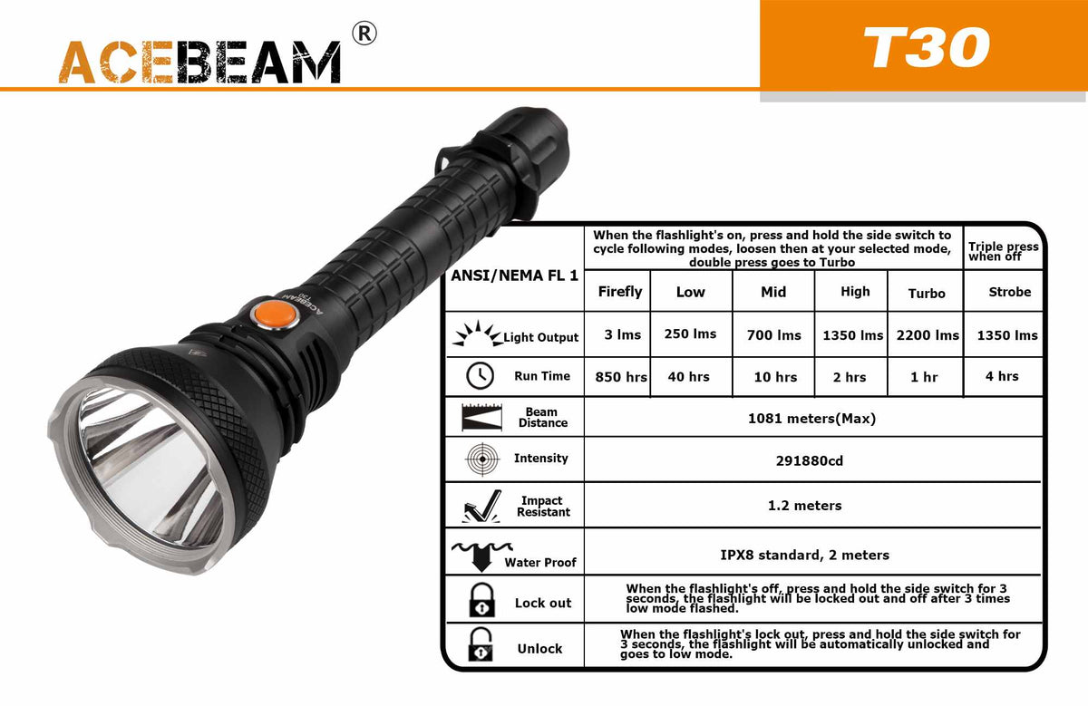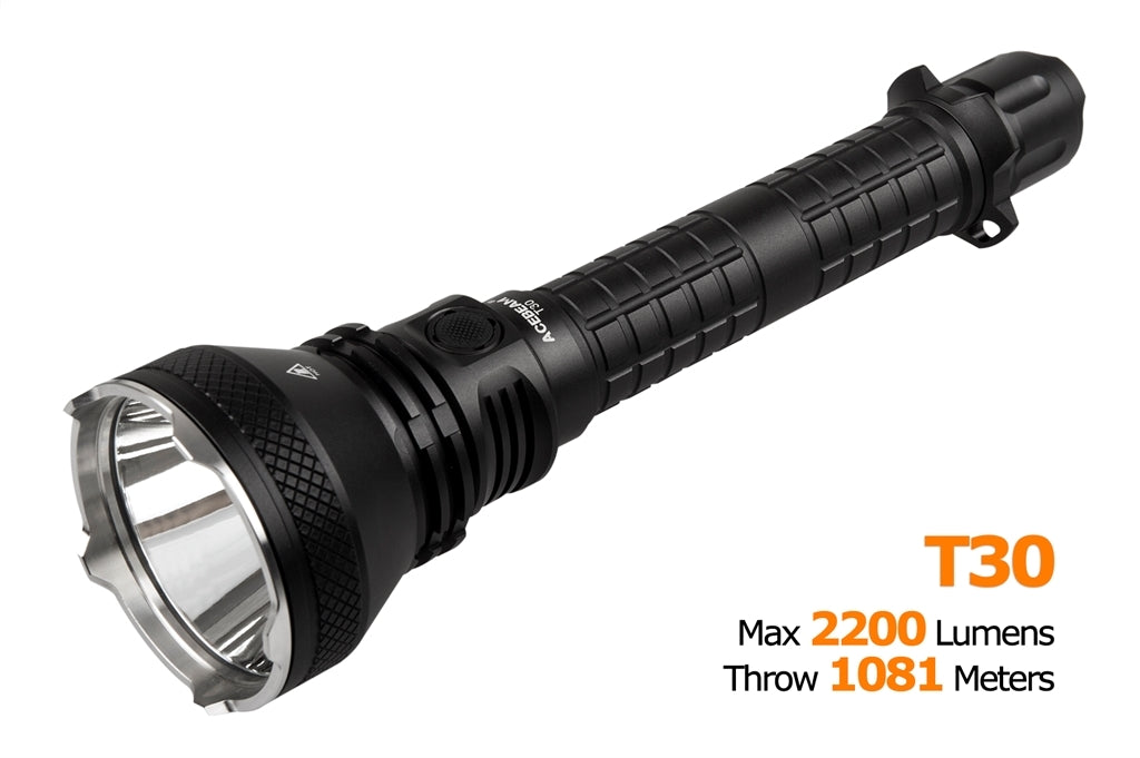 Acebeam T30 – magnetisk og oppladbar LED lommelykt med en enkelt Cree XHP35 High Intensity LED som har en maksimal utgang på 2200 lumen! Lyset har en kasteavstand på 1081 meter.