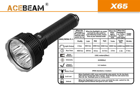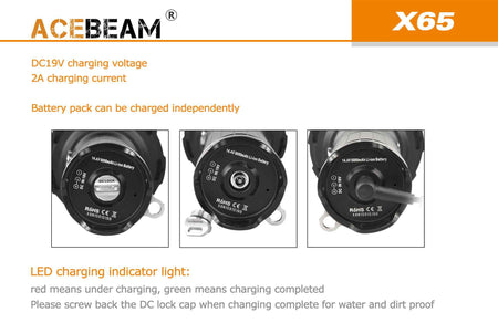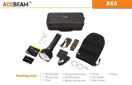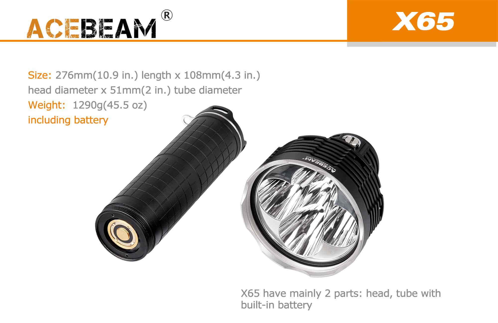 X65 kan lyse i 1 - 450 timer, avhengig av utgang, med en spesialbygd batteripakke som blir fulladet på tre timer. Den leveres i en veske med en universallader, en sterk skulderreim og reservedeler.