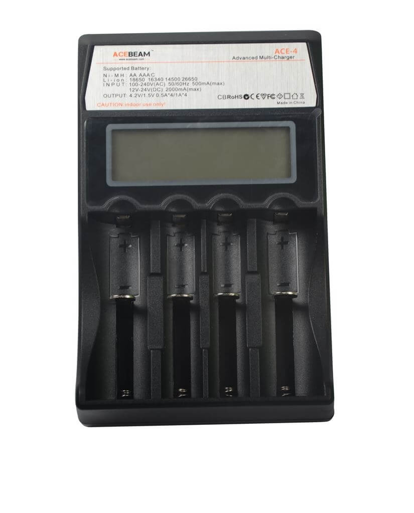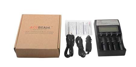 Multiladeren ACE-4 er en universell og automatisk smartlader, kompatibel med nesten alle typer oppladbare batterier. Det eliminerer dermed behovet for å eie flere ladere. Denne ACE-4 laderen kan automatisk identifisere Li-ion, Ni-MH og Ni-CD oppladbare batterier og bruker en passende ladetilstand. Hver av strømladerens fire micro datastyrte ladespor er i stand til å overvåke og lade batteriene uavhengig. I tillegg viser LCD-skjermen tydelig batteristatus og ladeprosess.