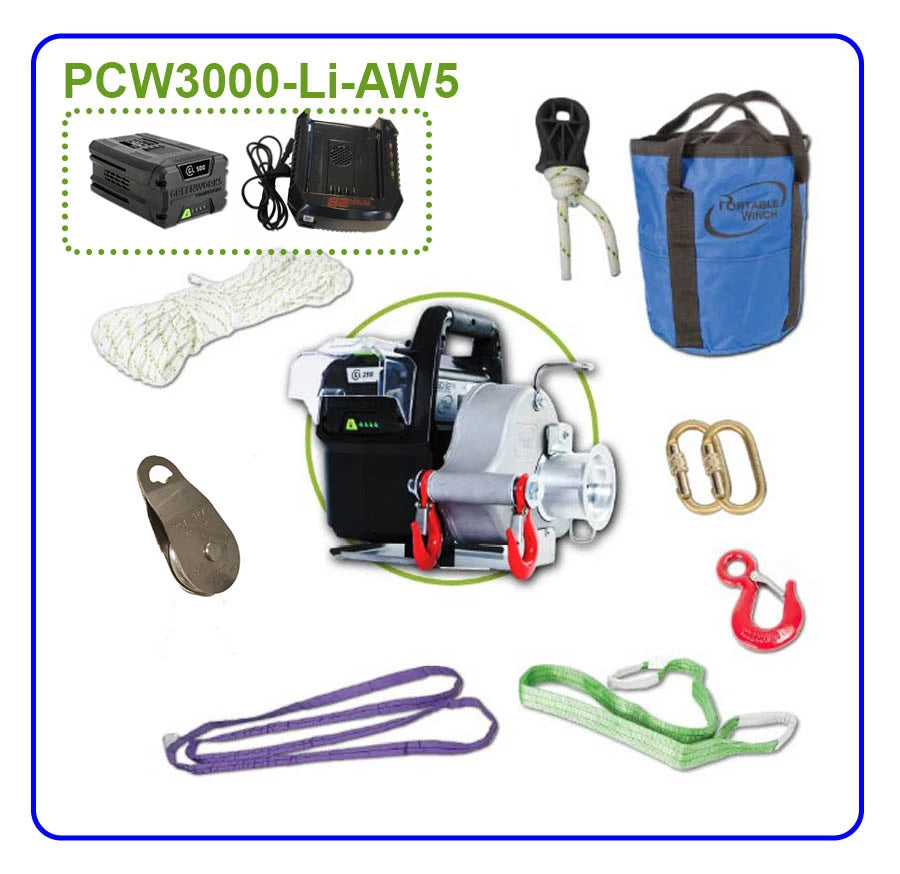 PCW3000-Li-AW5 Bærbar batteridrevet vinsj med tilbehør, 5A batteri og lader