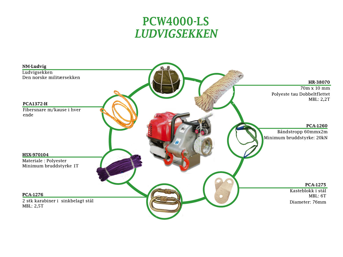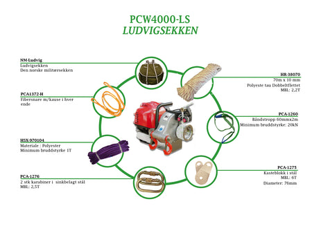 I tillegg til PCW-4000 vinsj og ludvigsekken får du med følgende utstyr: