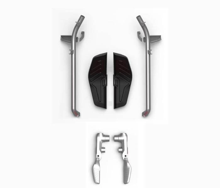 Dette settet kombinerer bakre fotpedaler og støtdemper til Super SOCO CU, og sikrer både komfort for passasjeren og bedre kjøreopplevelse. Støtdemperen reduserer vibrasjoner og støt fra veien, mens pedalene gir et trygt fotfeste.
