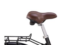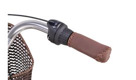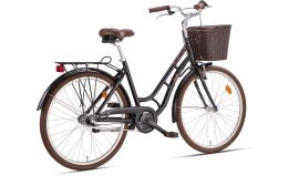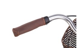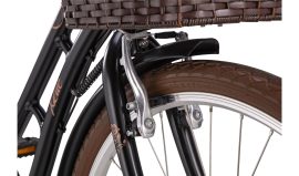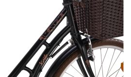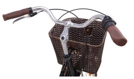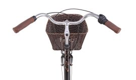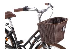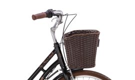 En flott rattan-kurv følger med for fastmontering – perfekt til bøker, vesker eller dagligvarer. Sykkelen leveres også med bagasjebrett, skjermer og støtte.