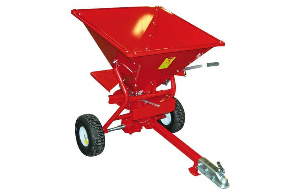 Profesjonell saltspreder med gode egenskaper som enkelt festes til ATV, hagetraktor eller bil. Den leveres med kulekobling (std. hengerfeste) og oljegirkasse i støpejern.