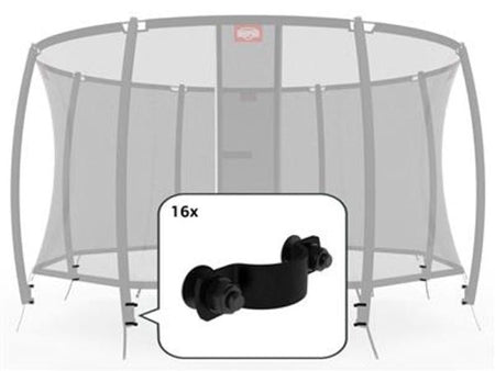 Festemiddelsett for BERG DELUXE sikkerhetsnett med 8 poler. Inneholder 16 deler som brukes til å feste sikkerhetsnettet trygt og stabilt til trampolinen.
