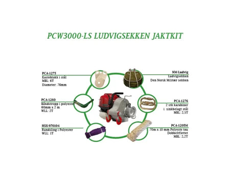 Denne komplette jaktpakken inneholder den kraftige og lette PCW-3000 portable vinsjen levert sammen med Ludvigsekken og et komplett sett med tilbehør. Perfekt for jakt, skogsarbeid, friluftsliv og redningsoppdrag. Sekken rommer hele pakken – gjør det enkelt å ta med seg utstyr i krevende terreng.
