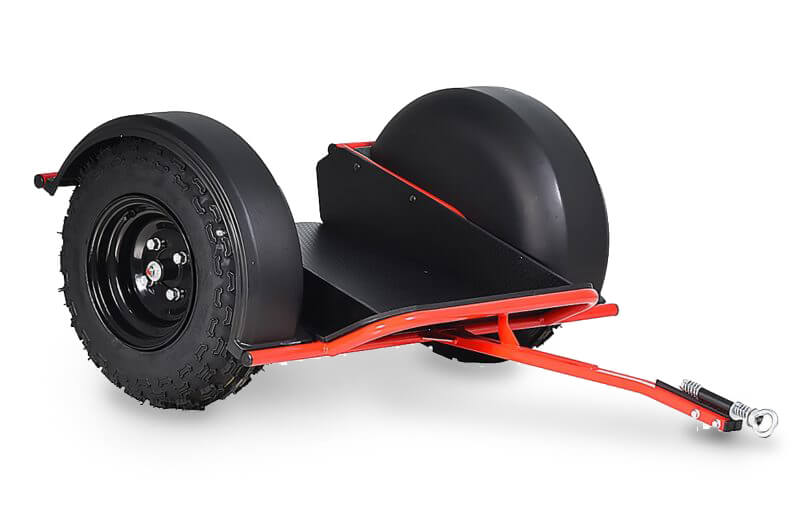 For transport av last kan en slede festes til den. Rørløse lavtrykksdekk gir god støtdemping, og skvettlapper beskytter mot stein- og vannsprut.