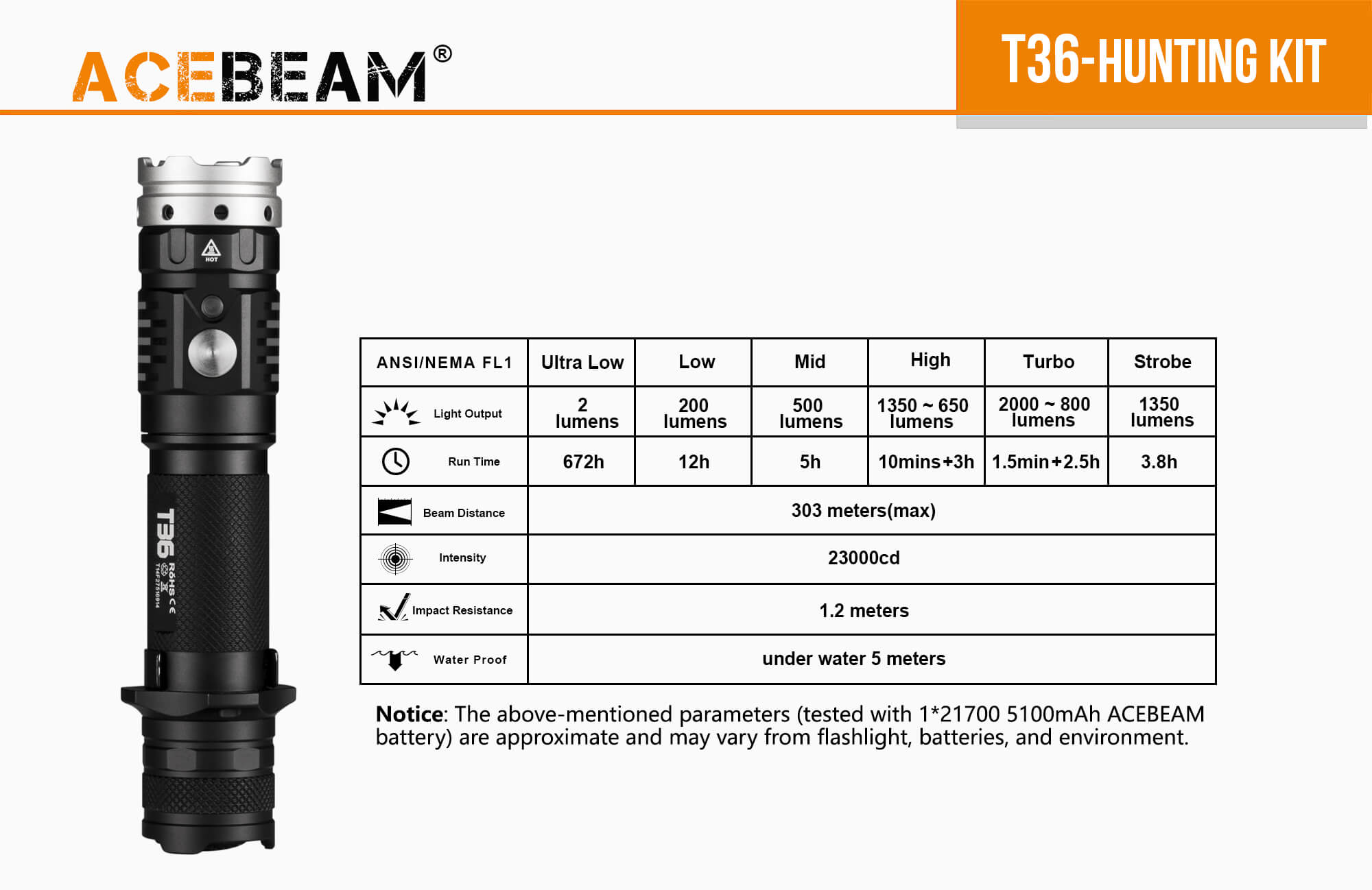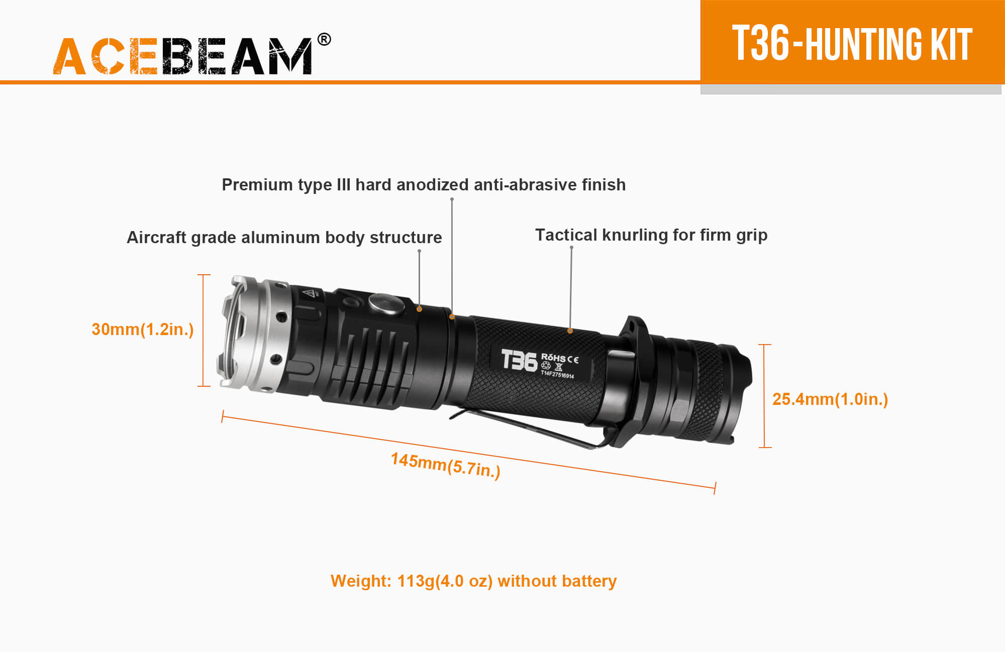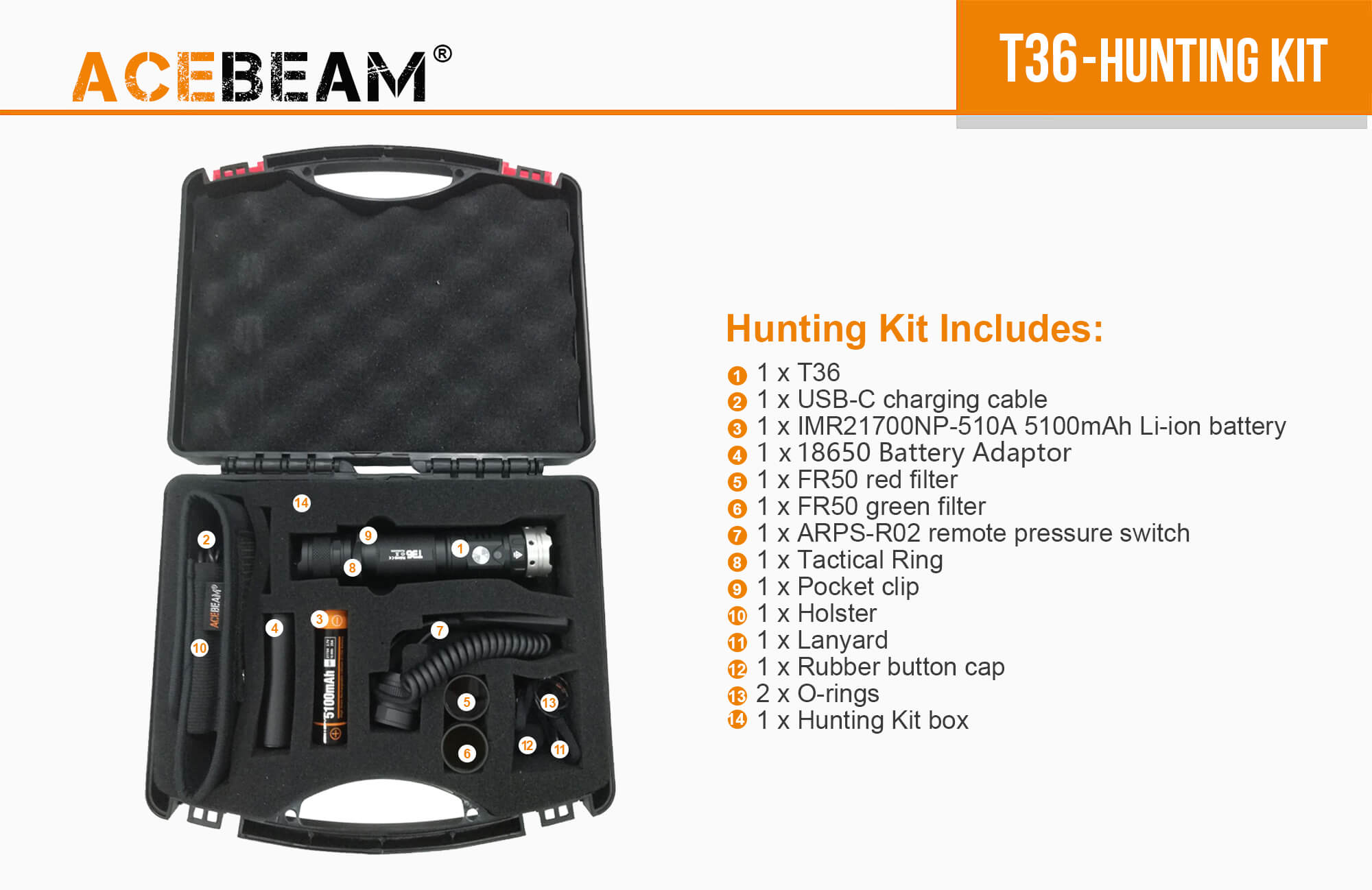 Acebeam T36 lommelykt-jaktkit kommer med oppladbar lommelykt + et utvalg av tilbehør for å gjøre enhver ekspedisjon vellykket.
