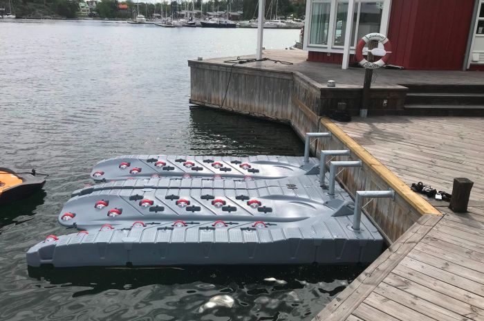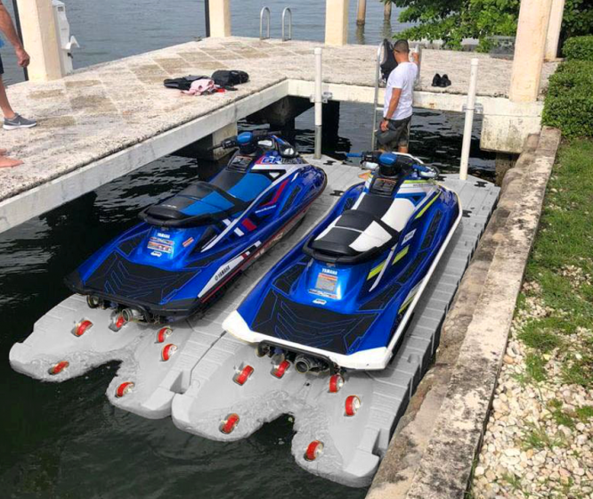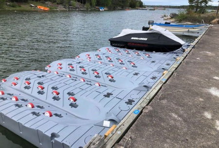 Med en jetski-brygge kan du forenkle båtlivet ditt betydelig. Med et lite trykk glir scooteren lett i vannet, og du kan straks gå ut og nyte bølgene. Og det er like enkelt å kjøre scooteren på igjen. Docken er meget stabil og usynkbar - laget i høyeste kvalitet! Den kan også kobles i serie.