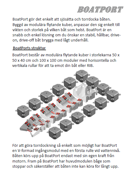 Den er bygget ut av modulære flytende kuber 50 x 50 x 40 cm og kroppsdeler 100 x 100 cm utstyrt med horisontale og laterale ruller. Inngangspartiet er V-formet med 1. rulle ved vannstand. På enden av båtløftet har hodedelen en hevet baug for å unngå overskyting.
