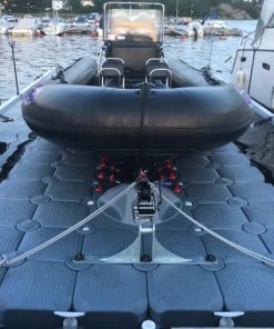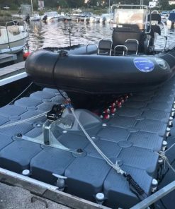 Båten din eller RIB kan lett kjøre på plattformen gjennom motorkraften. På enden av båtbryggen er det en forhøyet stoppblokk som hindrer deg i å kjøre i kanten av brygga, det er også mulig å feste til stoppblokken om ønskelig.