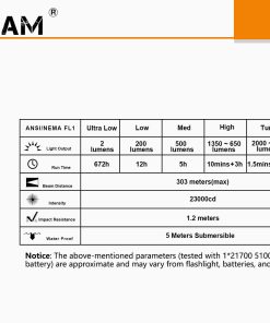 - Maks. utgang 2000 lumen ved å bruke 1 * 21700 batteri (inkludert)