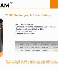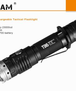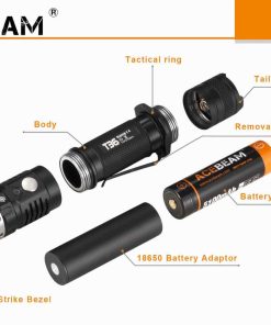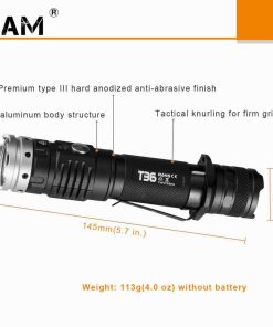 T36 har 5 lysstyrkenivå og en strobe-modus. Det er drevet av enkelt oppladbart 21700 Li-ion 5100mAh batteri. Acebeam T36 leverer lys på 2 lumen til 2000 lumen med en stråleavstand på opptil 303 meter.